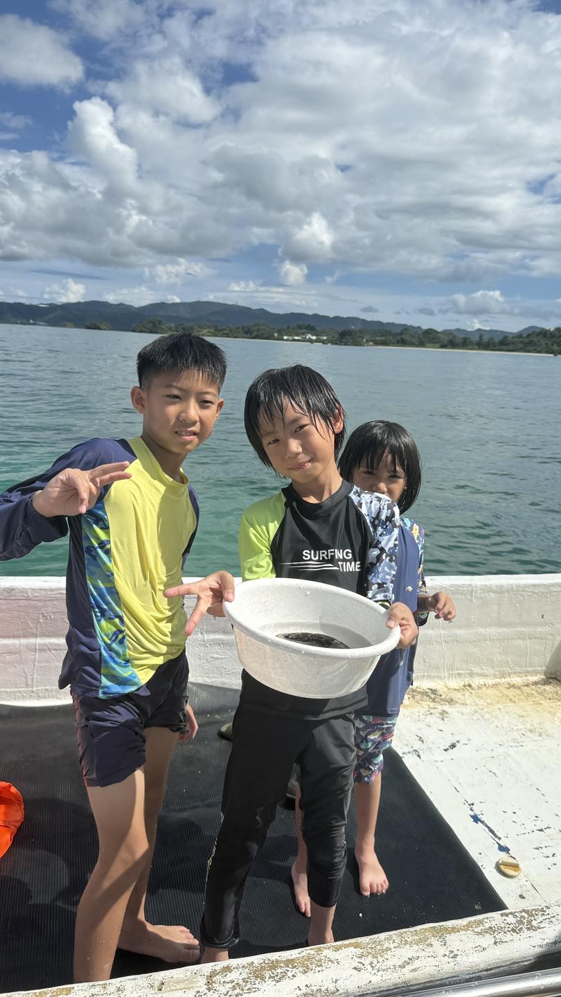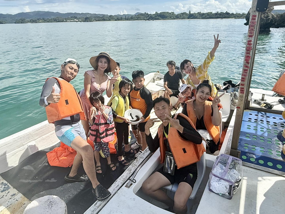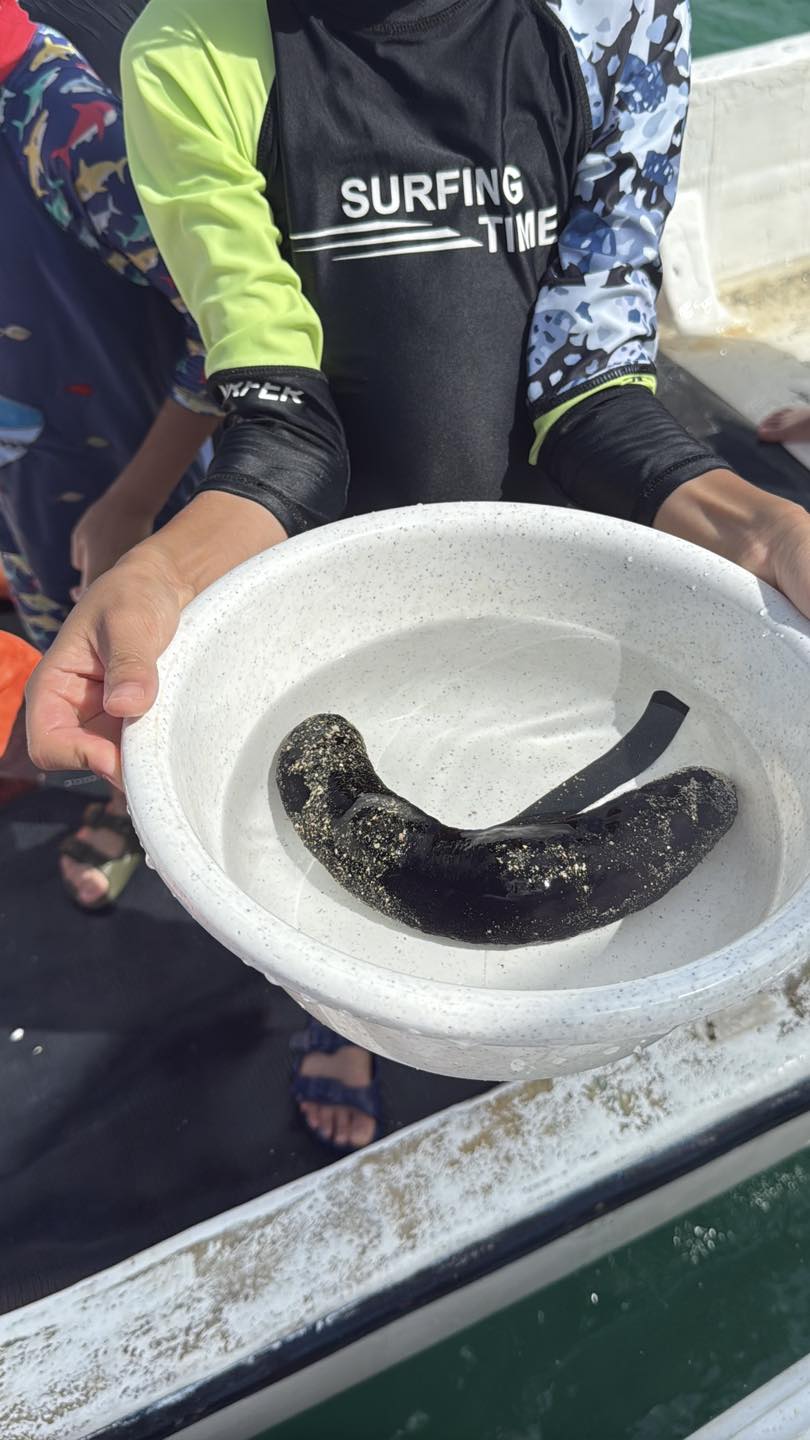 阿瑋也很開心,因為可以不用穿救生衣下去浮潛,他還從海底抓到兩隻海蔘。