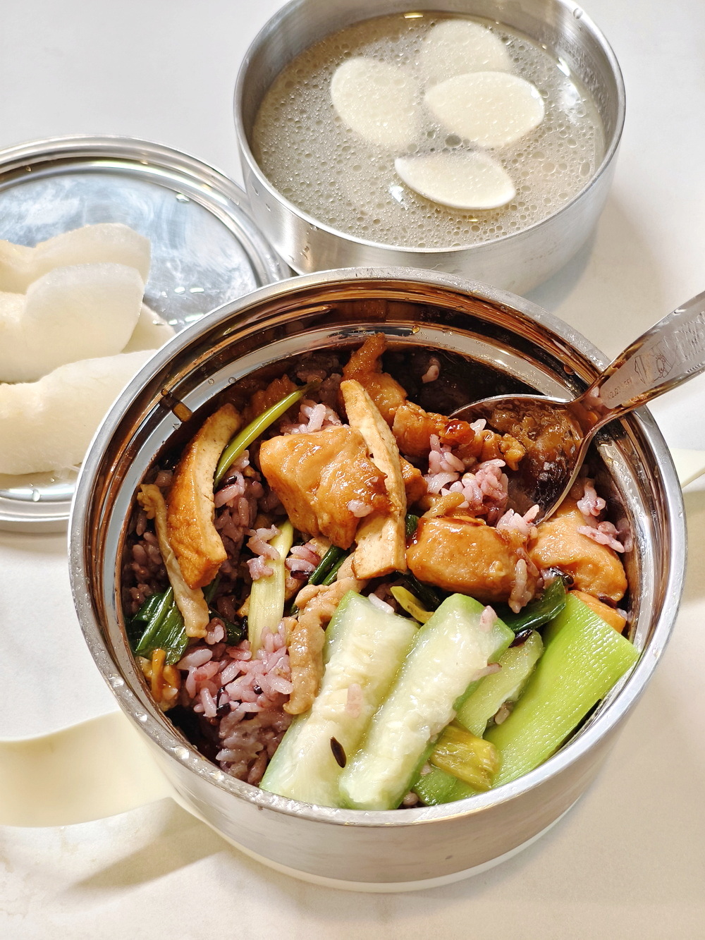 便當盒可以裝飯菜,雙層隔熱碗裝湯,蓋子可放水果