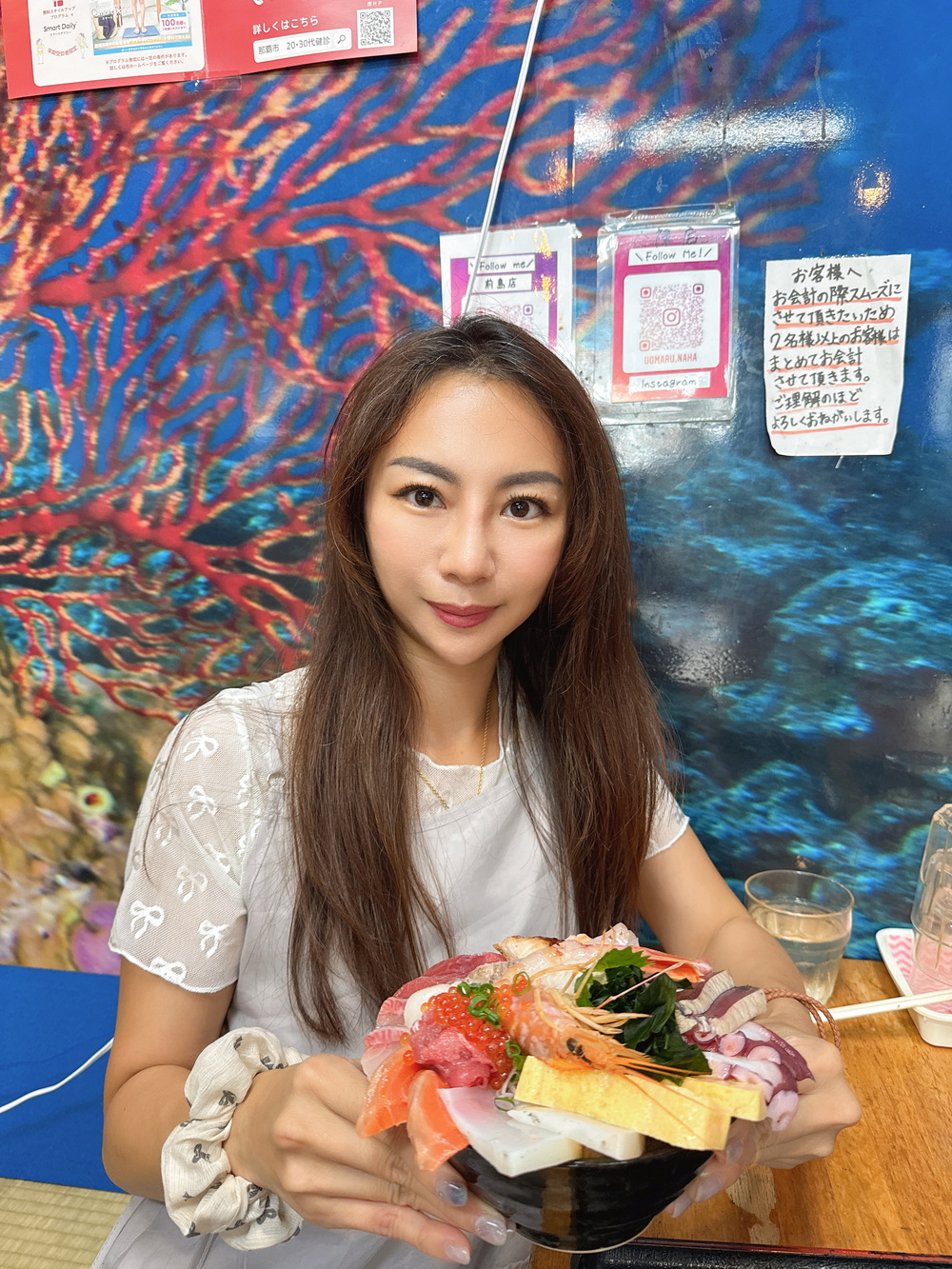 牆壁跟天花板有很多海洋生物的模型。海鮮丼飯超級好吃,而且很便宜。