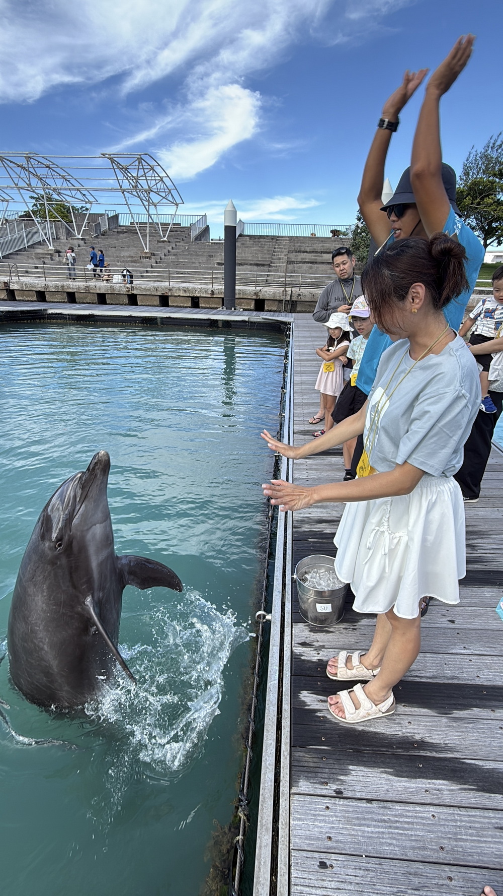 這邊有很多隻海豚,會餵魚給牠吃。牠會拍手、跳躍、還會發出可愛的叫聲。