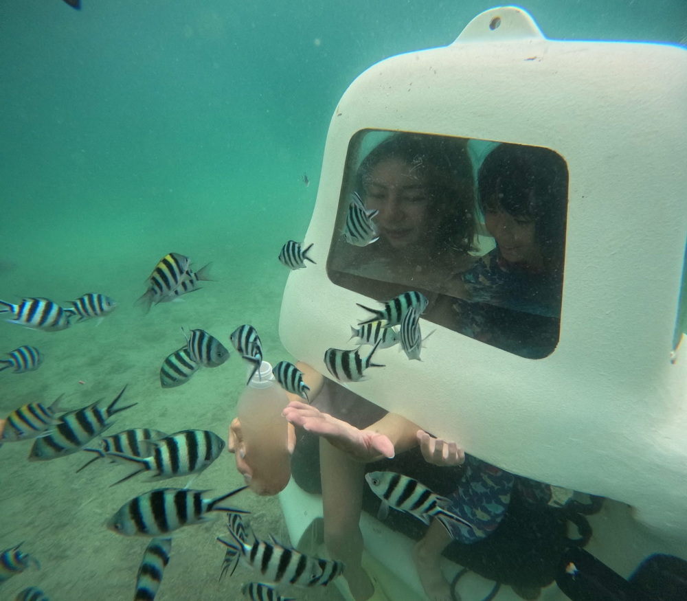 兩個人一台車,由升降梯降到海底,由潛水員帶我們近距離看魚、餵他們吃飼料。