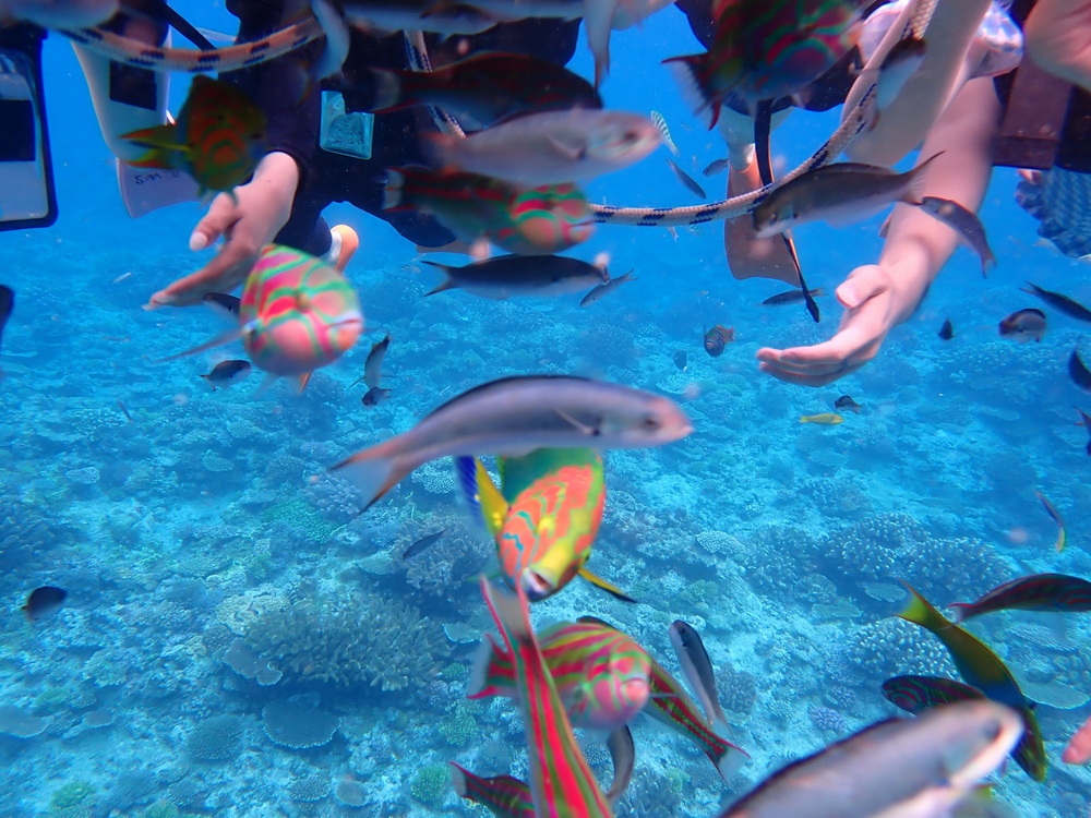 教練會發吐司給大家餵魚,魚超級超級近,好開心喔~
