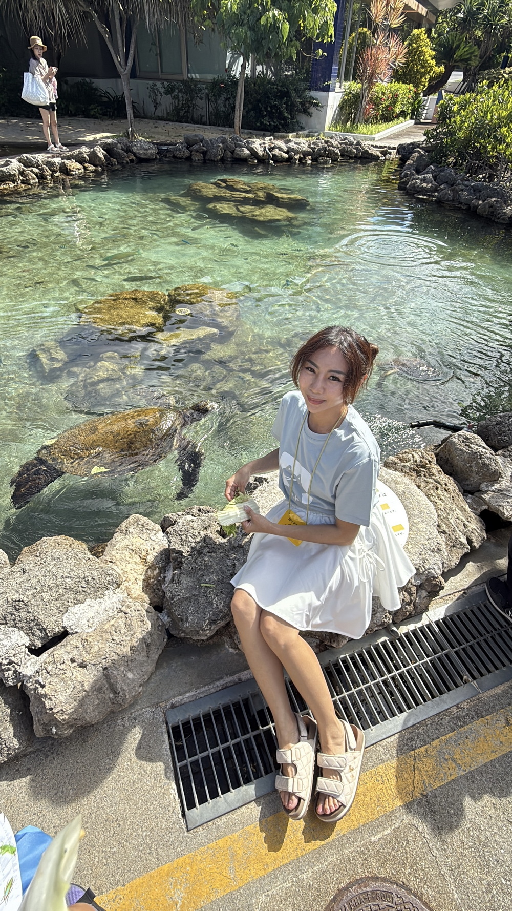 我們早上預約了餵食海豚的活動,在沖繩元氣村。先去餵陸龜、兔子、羊、海龜、海豚
