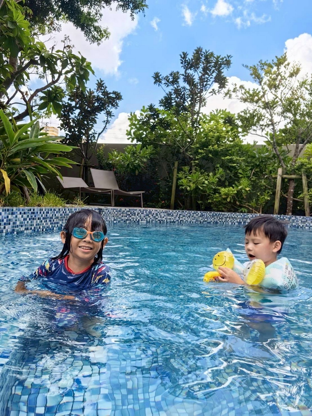 今天早上,阿瑋跟阿均帶三個小孩去飯店泳池玩水。