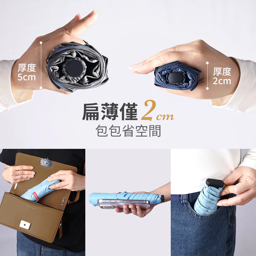 收起來的厚度只有2cm,跟一般圓柱狀的折傘比起來,更不佔空間
