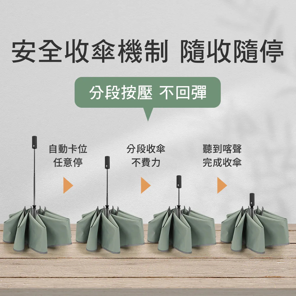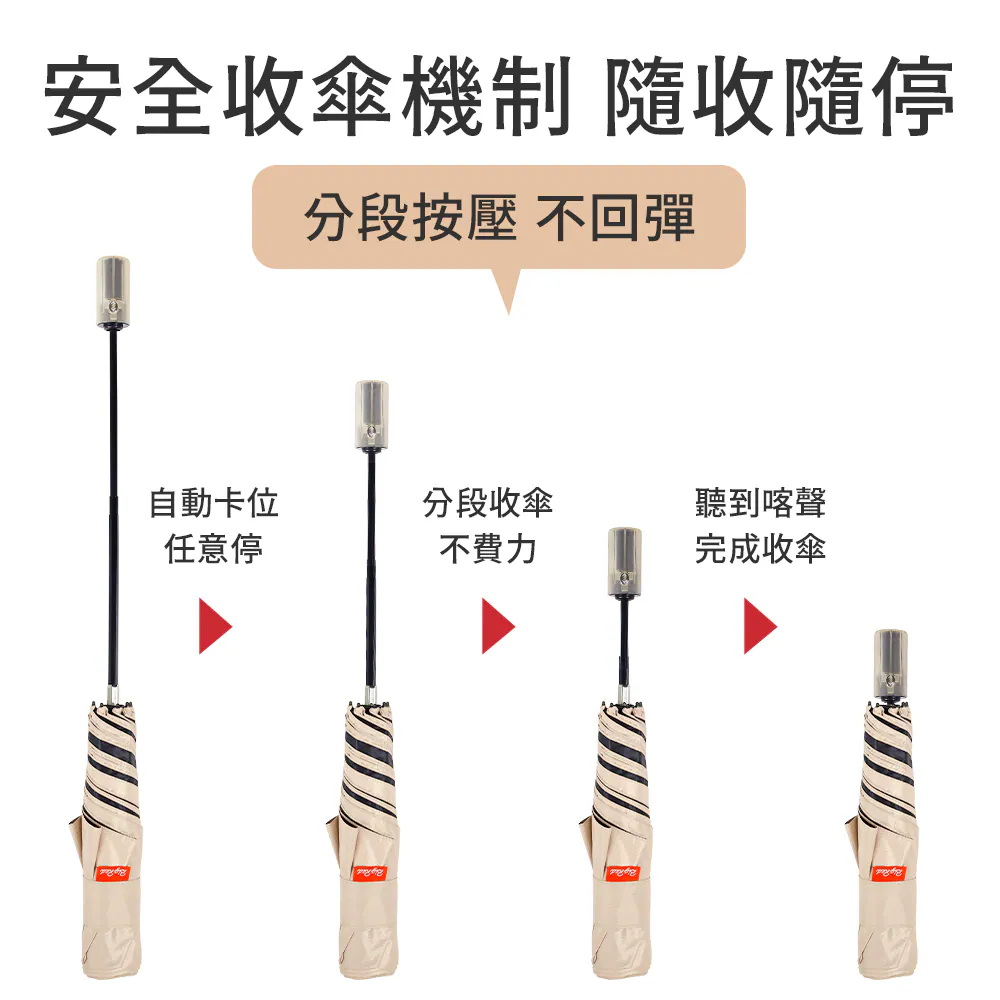 一般自動折傘收傘要一次壓到底,這把有安全收傘設計,壓到哪停到哪,不會回彈